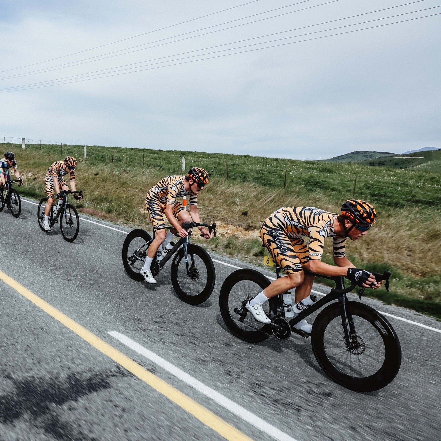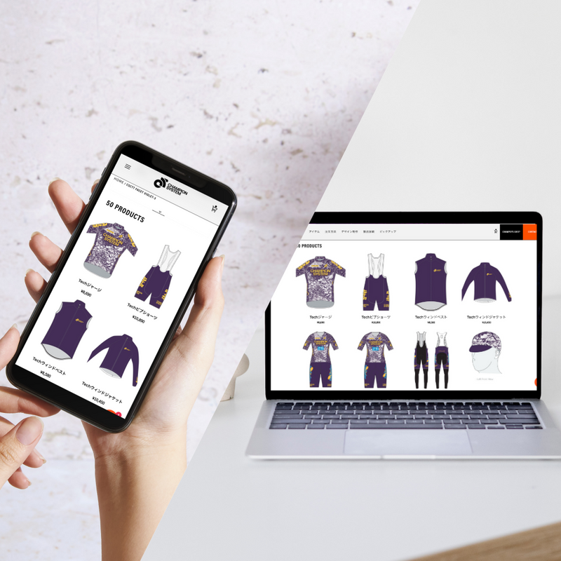 例:サイクルジャージのデザインから、ビブショーツやウィンドベスト、Tシャツまで、統一感のあるシリーズとして、当社のグラフィックチームが無料でデザインを制作できます。